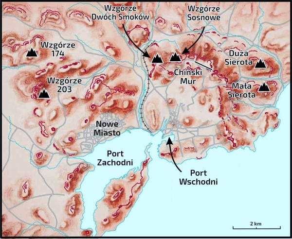 Do najbardziej znanych fortów należały te na kluczowych wzniesieniach: Wzgórze 203, Wzgórze 174, Mała Sierota, Duża Sierota oraz Wzgórze Fałszu. Wzgórza Sieroce były naturalnie strome. Aby jednak pomnożyć ich walory obronne, Rosjanie spiętrzyli rzekę Tai, która stała się dla tych wzniesień naturalną fosą.